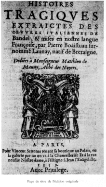 The progenitor of this kind of a story was Pierre Boaistuau with his translation of Matteo Bandello's Novelli published in French as Histoires tragiques (1559). Boaistuau selected from Bandello six most dark and gorey stories and changed them for his means. He was followed by François de Belleforest who adapted 12 more stories for the new edition in 1570.