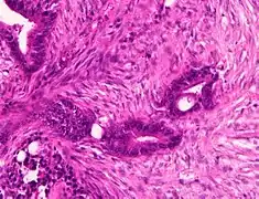 - Cribriform architecture, consisting of juxtaposed gland lumens without stroma in between, with loss of cell polarity. Rarely, they have foci of squamous differentiation (morules).[6]