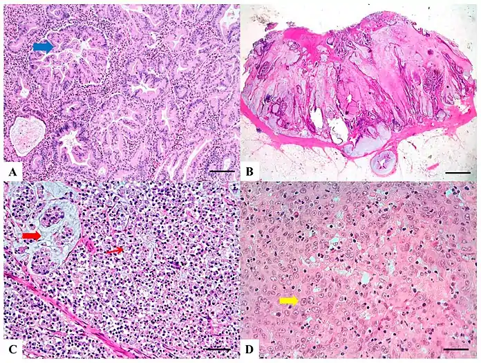 - Initially copied from: Remo, Andrea; Fassan, Matteo; Vanoli, Alessandro; Bonetti, Luca Reggiani; Barresi, Valeria; Tatangelo, Fabiana; Gafà, Roberta; Giordano, Guido; Pancione, Massimo; Grillo, Federica; Mastracci, Luca (2019). "Morphology and Molecular Features of Rare Colorectal Carcinoma Histotypes". Cancers. 11 (7): 1036. doi:10.3390/cancers11071036. ISSN 2072-6694. Attribution 4.0 International (CC BY 4.0) license