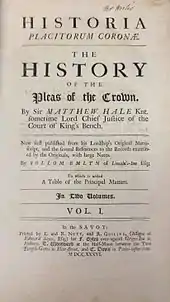 Historia Placitorum Coronæ or The History of the Pleas of the Crown is an influential treatise on the criminal law of England, written by Sir Matthew Hale and published posthumously with notes by Sollom Emlyn by E. and R. Nutt, and R. Gosling (the assigns of Edward Sayer), for F. Gyles, T. Woodward, and C. Davis in 1736.[1] The book was published despite an instruction in Hale's will that none of his manuscripts was to be printed after his death unless he had ordered the publication during his lifetime.[2] This was defended by Emlyn on the basis that it was a work of enormous importance; that he appeared to have revoked this instruction in a codicil; and that, in any event, it was obvious that he had intended to publish it. He further observed that the order was the result of fear that the text would be altered or abridged.