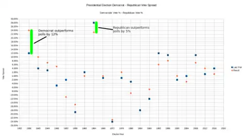 Gallup was the first polling organization to conduct accurate opinion polling for United States presidential elections.[1] Gallup polling has often been accurate in predicting the outcome of presidential elections and the margin of victory for the election winner. However, there were some close elections that it missed, such as 1948, 1976 and 2004, the popular vote in 2000, and the likely voter numbers in 2012. The month section in the tables represents the month that the opinion poll was conducted in. D stands for the Democratic Party while R stands for the Republican Party. There were also some third parties included in some of these polls, such as the Dixiecrats and the Reform Party.[2]