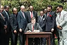 In 1980, Jimmy Carter signed an executive order to distribute adequate resources and funds to strengthen the nation's public and private HBCUs. His executive order created the White House Initiative on historically black colleges and universities (WHIHBCU), which is a federally funded program that operates within the U.S. Department of Education.[32] In 1989, George H. W. Bush continued Carter's pioneering spirit by signing Executive Order 12677, which created the presidential advisory board on HBCUs, to counsel the government and the secretary on the future development of these organizations.[33]