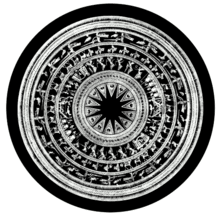 A common visual device in Buddhist art is the mandala. From a viewer's perspective, it represents schematically the ideal universe.[32][33] In various spiritual traditions, mandalas may be employed for focusing the attention of aspirants and adepts, a spiritual teaching tool, for establishing a sacred space and as an aid to meditation and trance induction. Its symbolic nature can help one "to access progressively deeper levels of the unconscious, ultimately assisting the meditator to experience a mystical sense of oneness with the ultimate unity from which the cosmos in all its manifold forms arises."[34] The psychoanalyst Carl Jung saw the mandala as "a representation of the centre of the unconscious self,"[35] and believed his paintings of mandalas enabled him to identify emotional disorders and work towards wholeness in personality.[36]