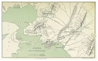 There is evidence that the site on which the Acropolis ('high city') stands was first inhabited in the Neolithic period, perhaps as a defensible settlement, around the end of the fourth millennium BC or a little later.[8] The site is a natural defensive position which commands the surrounding plains. It is located about 20 km (12 mi) inland from the Saronic Gulf, in the centre of the Cephisian Plain, a fertile valley surrounded by rivers. To the east lies Mount Hymettus, to the north Mount Pentelicus.