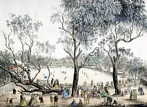 Victoria soon had a larger population than New South Wales, and its upstart capital, Melbourne, outgrew Sydney. But the New South Wales gold fields also attracted a flood of prospectors, and by 1857 the colony had more than 300,000 people. Inland towns like Bathurst, Goulburn, Orange and Young flourished. Gold brought great wealth but also new social tensions. Multiethnic migrants came to New South Wales in large numbers for the first time. Young became the site of an infamous anti-Chinese miner riot in 1861 and the official Riot Act was read to the miners on 14 July—the only official reading in the history of New South Wales.[1] Despite some tension, the influx of migrants also brought fresh ideas from Europe and North America to New South Wales—Norwegians introduced skiing in Australia to the hills above the Snowy Mountains gold rush town of Kiandra around 1861. A famous Australian son was also born to a Norwegian miner in 1867, when the bush balladeer Henry Lawson was born at the Grenfell goldfields.[2]