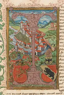 During the second half of the 12th century, Berchtold V of Zähringen built a small castle at Nydegg on the eastern part of the peninsula to guard the Aare. The castle stood on the border between the German-speaking Alamannians and the French-speaking Burgundians.[6] Whether there was already a settlement there when the castle was built or if the town was first founded near the castle in 1191 by Berthold V and the extent of the first town are all debated.[4] The original city was built westward along the narrow peninsula, with three main longitudinal streets running east to west. The layout and design of the city and the location of the church were all typical for Zähringen cities.