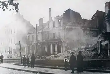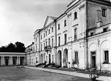 On 15 September, Białystok was occupied by the "Lötzen" Fortress Brigade under the command of General Otto-Ernst Ottenbacher.[72] Two days later, on 17 September Soviet troops joined them. Between 20 and 22 September discussions were held at the Branicki Palace regarding the transfer of the city from German to Soviet hands. According to the agreement, the Wehrmacht was to leave the city until 22 September by 14:00. At the conclusion of the negotiations, the delegations went to a dinner in Ritz Hotel. And so, On 22 September a ceremony of handing over the city was held at the courtyard of the Branicki Palace with the participation of Ivan Boldin who was the commander of the Cavalry-Mechanized Group in the Belarusian Military District and Andrey Yeremenko who was the commander of the 6th Cavalry Corps. The Germans handed over power to the Soviets and withdrew.[73] The city passed to the Soviet Union with respect to the secret protocol of the Molotov-Ribbentrop pact,[74]