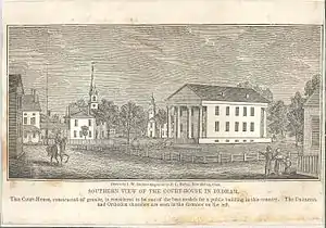 By the 200th anniversary of the town's incorporation in 1836, Dedham was "a thriving commercial and manufacturing center" and "a town which had long been a focus for the vigorous political activity popularly associated with the Jacksonian era."[54] In 1837, the year after the first rail line came to town, Dedham had a population of 3,532. By then the mills and factories in town were producing cotton and woolen goods, leather, boots, shoes, paper, marbled paper, iron castings, chairs, cabinet wares, straw bonnets, palm-leaf hats, and silk goods. Together they were worth $510,755 with the silk goods alone worth $10,000.