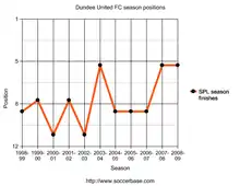 In 1997–98, United reached the League Cup final, but lost 3–0 to Celtic. United reached their first Scottish Cup final for eleven years in 2004–05, only to be beaten by Celtic again, 1–0. Since the SPL's conception in 1998, United have finished in the top half on only two occasions (2003–04, and 2007–08). They finished 9th for three consecutive seasons, between 2005 and 2007. However the purchase of the club by long-time supporter Eddie Thompson in 2002 brought a period of sustained investment in playing staff and managers. the 2007–08 season saw United narrowly lose the League Cup final on penalties, under manager Craig Levein and miss out on a UEFA Cup place in the last two matches of the season.