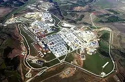 Camp Bondsteel played an important role in the economy of the city of Ferizaj. The camp was established immediately after the war. The camp is quite large: 955 acres or 360,000 square meters. Bondsteel is located on rolling hills and farmland near the city of Ferizaj.[47]