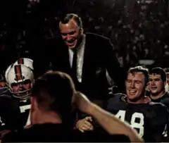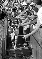 Graves fielded one of his best teams in 1966, finishing with a 9–2 record and defeating Georgia Tech 27–12 in the Orange Bowl (Florida's first major-bowl victory).[162] Halfback Larry Smith ran 94 yards for a touchdown while struggling to keep his pants up. His 187 yards rushing resulted in him being named the game's "Outstanding Player."[163] Spurrier won the Heisman Trophy[164] and was a unanimous All-American[165] after waving off Florida's kicker and booting a 40-yard field goal for a 30–27 victory against Auburn.[166] The 1967 Gators upset Georgia, which the 1966 team had not done. End Richard Trapp sparked a Florida comeback with a 57-yard touchdown catch-and-run. The Gators kicked a field goal with 34 seconds left to upset the Bulldogs, 17–16.[167] Graves signed Leonard George and Willie Jackson, Sr., the Gators' first two black football players, on December 17 and 18, 1968.[1] Since the NCAA did not permit freshmen to play on varsity teams, Jackson became the first black player (and starter) for the Gators during the 1970 season[1] and Florida integrated black players into the team.[168]