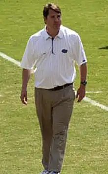 Zook was a strong recruiter, signing the 20th-ranked class in an abbreviated 2002 search,[239] the second-ranked class in 2003,[240] and the seventh-ranked class in 2004.[241] Zook's tenure was modestly successful, but well short of what Gator fans had come to expect. Although they were talented, Zook's teams were noted for inconsistency; they typically dominated their opponents in the first half and collapsed in the second.[242] They defeated Georgia (its only loss of 2002) and upset LSU in 2003 on its way to the BCS Championship,[243] but lost to both SEC Mississippi schools and twice to Miami.[244] The Gators lost six games at Ben Hill Griffin Stadium, one more than they had in 12 years under Spurrier.[245]