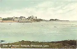 For its first 16 years, Greenwich was Dutch. One of Dutch Director Peter Stuyvesant's first actions was to strengthen his claim to Greenwich to prevent English colonies from establishing themselves closer to the Dutch on Manhattan.[3][4] He received title to all the land between the west bank of the Mianus River and Stamford's Mill River, (natively called the Seweyruc), and he confiscated the original purchase property in the process.[5] Angry Stamford demanded renegotiation of the border and in 1650, The Treaty of Hartford occurred which weakened Dutch control.[6][7] 1n 1656 New Haven Colony assumed control over the town, against the wishes of many residents. After the fall of the New Haven Colony, the Connecticut Colony assumed control in 1664 and the General Assembly in Hartford declared Greenwich a separate township from Stamford.[1]