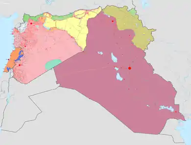 ISIL forces seized the majority of Al Anbar Governorate,[1] including the cities of Fallujah,[2] Al Qaim,[3] Abu Ghraib[4] and (in May 2015) Ramadi,[5] leaving them in control of 90% of Anbar.[6][7] Tikrit, Mosul and most of the Nineveh Governorate, along with parts of Salahuddin, Kirkuk and Diyala Governorates, were seized by insurgent forces in the June 2014 offensive.[8][9] ISIL captured Sinjar and a number of other towns in the August 2014 offensive, but Sinjar became a contested city in December 2014.