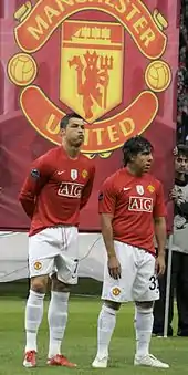 In 2000, Manchester United competed in the inaugural FIFA Club World Championship in Brazil,[12] and won the league again in the 1999–2000 and 2000–01 seasons. The team finished third in 2001–02, before regaining the title in 2002–03. They won the 2003–04 FA Cup, beating Millwall 3–0 in the final at the Millennium Stadium in Cardiff.[13] In the 2005–06 season, Manchester United failed to qualify for the knockout phase of the UEFA Champions League for the first time in over a decade, but recovered to secure a second-place league finish and victory over Wigan Athletic in the 2006 Football League Cup Final. The club regained the Premier League title in the 2006–07 and 2007–08 seasons, and completed the European double by beating Chelsea 6–5 on penalties in the 2008 UEFA Champions League Final in Moscow's Luzhniki Stadium. Ryan Giggs made a record 759th appearance for the club in this game, overtaking previous record holder, Bobby Charlton.[14] In December 2008, the club won the 2008 FIFA Club World Cup and followed this with the 2008–09 Football League Cup, and a third successive Premier League title, the first time any team had won three successive league titles more than once.[15][16] That summer, Cristiano Ronaldo was sold to Real Madrid for a world record £80 million.[17] In 2010, Manchester United defeated Aston Villa 2–1 at Wembley to retain the League Cup, their first successful defence of a knockout cup competition.[18]