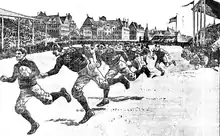 Michigan opened its 1888 season with a 14–6 victory over the Detroit Athletic Club at the Club's grounds in Detroit. The game attracted considerable interest and curiosity. The Detroit Free Press described the athletic grounds as "a gay scene" with young men "scampering over the field" in picturesque suits consisting of "close-fitting knitted caps of gay colors, canvas jackets and knickerbockers, stockings of various colors and shoes of all kind."[83] The paper wrote approvingly of the game: "The spectacle of twenty muscular young men in one colossal heap, struggling, pulling, hauling, pushing, with arms, legs and caps flying in every direction is an exciting and certainly novel one. ... All the ground and lofty tumbling was for the possession of a leather-covered foot ball, which every one of those twenty-two athletes had evidently determined to possess or perish in the attempt. ... While one unaccustomed to foot ball will naturally be startled by some of the acrobatic feats, still it is impossible to watch the game for any length of time without a tingling of the blood and holding of the breath. It is most intensely exciting, continuous in action and replete with fine points of play."[83]