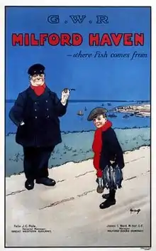 The town's population was further boosted by Quaker whalers from Nantucket, and a growing fishing industry that employed a large number of people. By 1849, the district of Hakin was described as a considerable centre of boat building, with approximately 200 "shipwrights residing at that place".[34] The Milford Docks Act 1874 authorised the construction of a docks in Hubberston Pill, a plan which was estimated to require two and a half years before completion. Actual completion was not achieved until 1888, delayed in part due to the bankruptcy of Samuel Lake.[6] Contemporary speculation suggested that a journey between London and New York via Milford would now be possible in less than seven days, two days fewer than the voyage on the established Liverpool route.[35] There was also considerable thought given to a proposed "Montreal & Milford Line", linking the two ports and potentially cutting the journey time even further than that of New York.[36] It was eventually finished in 1888, but the transatlantic trade hoped for never materialized.[13] Instead, the newly completed dockyard became the home of a sprawling fishing industry. By 1906, Milford had become the sixth largest fishing port in the UK, and in contrast to the general decline in Pembrokeshire's economy and a migration towards the South Wales Coal fields during the 1880s, its population rose. The Pembrokeshire Herald claimed in 1912 that "the fish trade is Milford's sole industry....the population of the town has doubled by means of it".[37] In 1863, the railway network came to Milford, linking it to the Haverfordwest line and beyond. In 1866, work was completed on an additional extension which provided access to the docks and mining depot on the eastern side of the town.[38] If the Manchester and Milford Railway scheme had come to fruition, the town would have enjoyed a direct rail link to the Midlands and Northwest England.