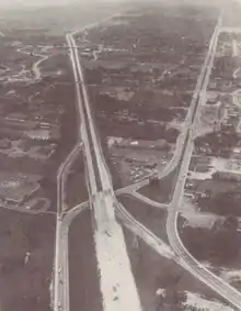 Collaboration between the city and NCC's predecessor, the Federal District Commission also led to major water and sewer projects, the construction of the Queensway which had been the old GTR/CNR right of way, several bridges, expansion of Carling Avenue, and the offer of F.D.C. land at Green Island (near Rideau Falls) to create city hall, opened in 1958.[60] Until then, the city had been without a permanent building for around 17 years. It was in use until 2000, when Ottawa City Hall occupied the former headquarters of the municipality.[60]