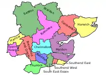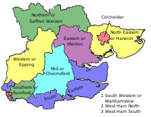 | 1885 | Under the Redistribution of Seats Act 1885,[1] the three 2-member county divisions were replaced by eight single-member constituencies, namely the North Eastern or Harwich Division (which absorbed the abolished Parliamentary Borough of Harwich), the Eastern or Maldon Division (which absorbed the abolished Parliamentary Borough of Maldon), the South Eastern Division, the Mid or Chelmsford Division, the Northern or Saffron Walden Division, the Western or Epping Division, the South Western or Walthamstow Division and the Southern or Romford Division.