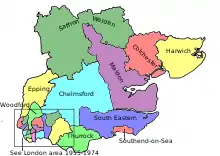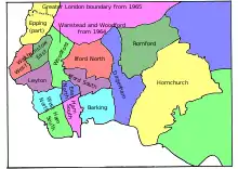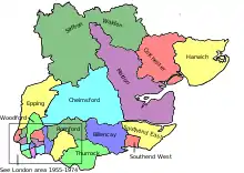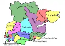 South East Essex was re-established, comprising the Urban Districts of Benfleet, Canvey Island and Rayleigh, which were previously included in the Billericay constituency, along with Rochford, transferred back from Southend East. Billericay now comprised the Urban District of Billericay (renamed Basildon Urban District shortly afterwards), along with that of Brentwood, transferred from Romford.[4] Following an interim review of boundaries in 1960, Woodford was renamed Wanstead and Woodford with only minor boundary changes. This came into effect for the 1964 general election. On 1 April 1965, the south-western corner of the county of Essex was incorporated into the new county of Greater London, resulting in the majority of the electorate and parliamentary constituencies being removed. As a result, the constituency of Epping was split between Essex and Greater London, with the area comprising the former Urban District of Chingford being included in the new London Borough of Waltham Forest. |