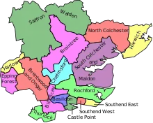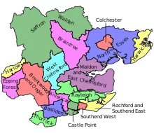 | 2010 | Under the Fifth Periodic Review of Westminster constituencies,[9] the Boundary Commission for England increased Essex's representation again, with the creation of the constituency of Witham. Approximately half of the new seat came from the Braintree constituency, including the town of Witham itself, with parts also transferred from Colchester, North Essex, and Maldon and East Chelmsford. Further boundary changes were as follows:
