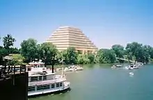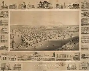The real city of Sacramento was developed around a wharf, called the Embarcadero, on the confluence of the American River and Sacramento River that Sutter had developed prior to his retirement in 1849 as a result of gold discoveries at Sutter's Mill in Coloma.[24] John Sutter, Sr. had replaced himself with his son, John Sutter, Jr., who noticed growth of trade at the Embarcadero and considered it a viable economic opportunity; the port was used increasingly as a point of debarkation for prospecting Argonauts heading eastwards.[25] Sutter, Jr. had military officials William H. Warner and his assistant, William Tecumseh Sherman, survey his father's holdings for a location where he could establish a new city and create the city over a grid of numbered and lettered streets for organizational purposes. A number of businessmen, including millionaire-to-be Samuel Brannan, future California governor Peter Burnett, and George McDougall, brother of future California governor John McDougall, were attracted to the waterfront location.[25] However, Sutter, Jr. and George McDougall disagreed over the terms of the lease of the location, and a trade war erupted between Sutter's Sacramento City and McDougall's new base of operations at Sutterville. Sutter, Sr., who had opposed many of his son's decisions, resumed control of his business affairs after Sutter, Jr. ended the competition between the two cities; trade in the area was biased toward Sacramento City as a result of Sutter, Jr.'s efforts.[25]