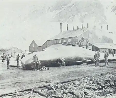 Most of the whalers were Norwegian, with an increasing proportion of Britons. During the whaling era, the population usually varied from over 1000 in the summer (over 2000 in some years) to some 200 in the winter. At the height of the whaling industry about 6000 men, mostly Norwegians and Swedes, worked at the stations and, with the men working on the whale-catchers, factory ships and supply vessels, there could be three times the population when the whaling fleets were at anchor in the harbours.[12] The first census conducted by the British Stipendiary Magistrate James Wilson on 31 December 1909 recorded a total population of 720, including 3 females and 1 child. Of them, 579 were Norwegian, 58 Swedes, 32 Britons, 16 Danes, 15 Finns, 9 Germans, 7 Russians, 2 Dutchmen, 1 Frenchman and 1 Austrian. In subsequent available censuses the population was 1337 (24 April 1921[13]), and 709 (26 April 1931,[14] includes the South Shetland Islands).