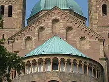At the northeastern corner of the cathedral a palace (Pfalz) was added for the bishop and visiting royalty, completed around 1044/45. It had become a custom in Carolingian times that bishops expanded their residences in order to host kings or emperors on tour. The palace was 74 metres long, 16 metres wide and had three floors with heights of 6 metres each. It had its own chapel and was linked to the northeastern corner of the cathedral. The dimensions and elaborate architectural design were exceptional for profane buildings in the Salian era.[12] A cloister and a number of buildings for the chapter and church administration were added on the southern side of the cathedral. Altogether, cathedral and additions presented a representative assembly of stately buildings with nothing comparable in the Salian empire.[12]