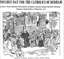 In 1880, the pastor of St. Mary's was also responsible for churches in South Dedham, East Dedham, and West Roxbury.[25][17] During this decade, Father Johnson was publicly raising the issue of discrimination against Catholics in the public schools. In 1885, as a member of the School Committee,[lower-alpha 8] he claimed the principal of the Avery School ridiculed Catholic students,[26] and several years later had a lengthy debate with a Protestant minister via letters in the Dedham Standard about the "rank misrepresentation of the Catholic Church" in a history book adopted by the School Committee.[27]