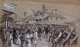 In May, federal troops arrived in Tampa to occupy the fort and the town as part of Reconstruction. They would remain until August, 1869.[35] It left much of the town in disrepair and the population depleted. As one returning soldier wrote, "Tampa was a hard-looking place. Streets and lots were grown up with weeds and the outlook certainly was not very encouraging."[37] Simon Turman's wife Meroba Hooker Crane operated the Orange Grove Hotel since 1867, and helped preserve Oaklawn Cemetery.