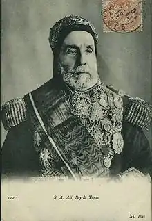 Paul Cambon, the first Resident-Minister (after 1885 called the Resident-General) of the French Protectorate, arrived in early 1882. According to agreement he assumed the office of the Bey's foreign minister, while the general commanding French troops became the minister of war. Soon another Frenchman became director-general of finance.[23] Sadiq Bey died within a few months. Cambon wanted to demonstrate the complete disestablishment of Ottoman claims to suzerainty in Tunisia. The Ottomans beforehand agreed to acquiesce. Accordingly, Cambon designed and orchestrated the accession ceremony of 'Ali Bey (1882–1902). Cambon personally accompanying him from his La Marsa residence to the Bardo Palace where Cambon invested him as the new Bey in the name of France.[24]