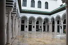 Prior to the Protectorate the schools open to the majority of Tunisians were religious, e.g., the many local kuttab whose curriculum centered on the memorization and study of the Qur'an. These schools were usually proximous to the mosque and run by the imam. Students might progress to further such instruction at advanced schools.[39] Especially noteworthy in this regard, but at the highest level, was the leading theological facility at the Mosque of Uqba in Kairouan, founded circa 670. During the 9th-11th centuries, in addition to religious subjects, medicine, botany, astronomy, and math were taught. Above all the Uqba Mosque then was the center of the Maliki school of law. Muslim scholars, the ulama from throughout northern Africa, came here to study.[40][41]