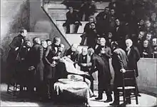 Such displays of the anaesthetic qualities of mesmerism inspired some medical practitioners to attempt surgery on subjects under the spell of magnetism.[91] In France, the first major operation of this kind had been trialled, apparently successfully, as early as 1828 during a mastectomy procedure.[92] In Britain the first significant surgical procedure undertaken on a patient while mesmerised occurred in 1842 when James Wombell, a labourer from Nottingham, had his leg amputated.[93] Having been mesmerised for several days prior to the operation by a barrister named William Topham, Wombell exhibited no signs of pain during the operation and reported afterwards that the surgery had been painless.[94] This account was disputed by many in the medical establishment who held that Wombell had fraudulently concealed the pain of the amputation both during and after the procedure.[95] Undeterred, in 1843 Elliotson continued to advocate for the use of animal magnetism in surgery publishing Numerous Cases of Surgical Operation without Pain in the Mesmeric State.[96] This marked the beginning of a campaign by London mesmerists to gain a foothold for the practice within British hospitals by convincing both doctors and the general public of the value of surgical mesmerism.[97] Mesmeric surgery enjoyed considerable success in the years from 1842 to 1846 and colonial India emerged as a particular stronghold of the practice; word of its success was propagated in Britain through the Zoist and the publication in 1846 of Mesmerism in India and its Practical Application in Surgery and Medicine by James Esdaile, a Scottish surgeon with the East India Company and the chief proponent of animal magnetism in the subcontinent.[98]