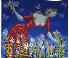 Flowers were selected according to symbolic meaning, with emphasis on religious significance. The lotus flower or water lily, for example, was considered sacred to Isis and was often included in arrangements. Many other flowers have been found in the tombs of the ancient Egyptians, and garlands of flowers were worn by loved ones and left at the tombs.[2] These included blue scilla, poppy-flowered anemone, Iris sibirica, delphinium, narcissus, palm tree, papyrus and rose.[1] Egyptian wall paintings depicting roses have been found in tombs dating from the fifth century B.C. to Cleopatra's time.[3]
