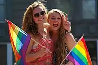 In the 1970s open lesbians also began their first forays into American politics. In 1972, Nancy Wechsler became the first openly gay or lesbian person in political office in America; she was elected to the Ann Arbor City Council in 1972 as a member of the Human Rights Party and came out as a lesbian during her first and only term there.[116] That same year, Madeline Davis became the first openly lesbian delegate elected to a major political convention when she was elected to the Democratic National Convention in Miami, Florida. She addressed the convention in support of the inclusion of a gay rights plank in the Democratic Party platform. In 1974, Elaine Noble became the first openly gay or lesbian candidate ever elected to a state-level office in America when she was elected to the Massachusetts House of Representatives.[117] She had come out as a lesbian during her campaign.[117] Furthermore, the first openly gay or lesbian person to be elected to any political office in America was Kathy Kozachenko, who was elected to the Ann Arbor City Council in April 1974.[118] In 1977, Anne Kronenberg was Harvey Milk's campaign manager during his San Francisco Board of Supervisors campaign, and she later worked as his aide while he held that office.[119] (While Kronenberg identified as a lesbian at that time, she later fell in love with and married a man she met in Washington, D.C. in the 1980s.[120]) In 1978, lesbian Sally Miller Gearhart fought alongside Harvey Milk to defeat Proposition 6 (also known as the "Briggs Initiative" because it was sponsored by John Briggs), which would have banned gays and lesbians from teaching in public schools in California.[121] Gearhart debated John Briggs about the initiative, which was defeated.[122][123][124] A clip of their debate appeared in the documentary film The Times of Harvey Milk, which also included Gearhart talking about working with Milk against Proposition 6, and appearances by Kronenberg.