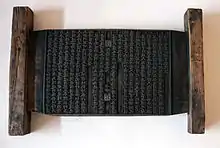 Bi Sheng also developed wooden movable type, but it was abandoned in favor of ceramic types due to the presence of wood grains and the unevenness of the wooden type after being soaked in ink.[42][43] However wooden movable type had evidently reached the Tangut Western Xia to the west by the 12th century. There, the Tanguts printed the Auspicious Tantra of All-Reaching Union, a 449-page text considered to be the earliest extant example of a text printed using the wooden movable type.[44]