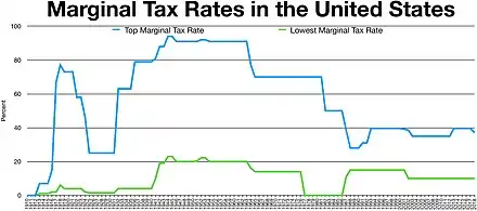 Following World War II tax increases, top marginal individual tax rates stayed near or above 90%, and the effective tax rate at 70% for the highest incomes (few paid the top rate), until 1964 when the top marginal tax rate was lowered to 70%. Kennedy explicitly called for a top rate of 65 percent, but added that it should be set at 70 percent if certain deductions weren't phased out at the top of the income scale.[24][25][26] The top marginal tax rate was lowered to 50% in 1982 and eventually to 28% in 1988. It slowly increased to 39.6% in 2000, then was reduced to 35% for the period 2003 through 2012.[23] Corporate tax rates were lowered from 48% to 46% in 1981 (PL 97-34), then to 34% in 1986 (PL 99-514), and increased to 35% in 1993, then 21% in 2018.