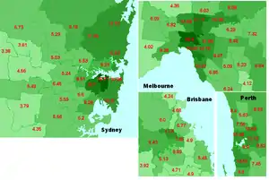 As in previous years, the Greens' vote was strongest in inner-city seats, including Melbourne (22.7% of primary votes), Sydney (20.7%), Grayndler (18.7%), Denison (18.6%) and Batman (17.2%).[18] Strong votes were also recorded in Liberal-held city based seats such as Higgins (10.8%), Kooyong (11.8%) Curtin (13.4%) and Wentworth (15.0%). The primary vote for the Greens in suburban and regional areas was generally smaller.