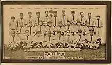 Other team names used to refer to the franchise that finally came to be called "the Dodgers" were the Atlantics (1884, not directly related to the earlier Brooklyn Atlantics), Bridegrooms or Grooms (1888–1898),[12] Ward's Wonders,[13] the Superbas (1899-1910),[14] and the Robins (1914–1931).[15] All of these nicknames were used by fans and newspaper sports writers to describe the team, often concurrently, but not in any official capacity. The team's legal name was the Brooklyn Base Ball Club.[16] However, the "Trolley Dodgers" nickname was used throughout this period, along with other nicknames, by fans and sports writers of the day. The team did not use the name in a formal sense until 1916, when the name was printed on home World Series programs; the word "Dodgers" finally appeared on team jerseys in 1932.[17] The "conclusive shift" came in 1933, when both home and road jerseys for the team bore the name "Dodgers".[18]