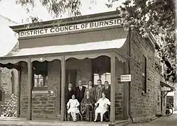 The new Burnside District Council held its first meeting at the Greengate Inn, Tusmore on 19 August 1856. Due to the time it took to elect new councillors, it was not until 29 December that the council met again. Dr Christopher Penfold, chairman, met the rest of the representatives there: Daniel Ferguson of Glenunga, Alexander Ferguson of Monreith, John Townsend of Magill and James Grylls of Belle Vue.[23] It was during this time that Kent Town decided against becoming a part of Burnside and instead applied to enter the Corporate Town of Kensington and Norwood. The council was to meet at the Inn or at Ferguson's home right up until December 1869, when the first council chambers were built. However, it was still able to operate and fulfill its obligations under the Local Government Act 1852. These included the management of minor roads, the administration of abattoir licences and public houses, and the prevention of the spread of the noxious Scotch thistle. The council was also obliged, under a different act of 1851, to encourage education. Much road and bridgework activity happened after the council had been formed—early residents were amazed at the influx of development and construction that occurred. At the same time, the council was almost overwhelmed by the amount of work requested, and was forced to ask individual ratepayers for monetary assistance when building bridges in their area.[24]