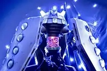The White Supreme Dalek, Yellow Eternal Dalek and Red Drone Dalek reappear in "The Pandorica Opens" (2010) as part of the Alliance. They are present at the opening of the Pandorica and the Supreme Dalek reveals the origin behind the Pandorica, the Alliance and Stonehenge before the Eleventh Doctor is imprisoned in the Pandorica prison.[43] In follow-up episode "The Big Bang" (2010), after all of reality becomes cracked, the Daleks turn to stone due to their history being erased. A Stone Dalek is later seen at a museum with the Pandorica, and is awoken when it gets hit by the regenerative field of the Pandorica. It pursues and shoots the Doctor, but due to its power being weak, it was not a fatal shot. However, River Song, enraged and believing the Doctor to be dead, aims her gun at the Stone Dalek, knowing that its defences were weak. She later claims that the Dalek died, but it is not shown onscreen whether it did. By the end of the episode, the Doctor reverses the explosion of the TARDIS and the collapse of reality.[44] A Dalek briefly appears in "The Wedding of River Song" (2010), having been heavily damaged by the Eleventh Doctor, who then rips its dome off and scans its data core for information about the Silence. This Dalek is the same design as the New Paradigm Daleks.[45]