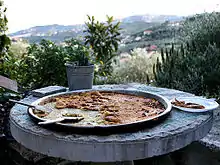 Many of the Gibraltarian cuisine's roots also lie in Genoa. The most notable dish of Genoese origin (in spite of its Spanish name) is Gibraltar's national dish, calentita.[13] It is a chickpea flour-based flatbread similar to the Italian farinata.[14]