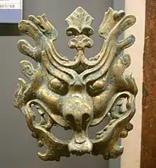 The half-Chinese, half-Xiongnu noble Yituzhiyashi (伊屠智牙師), son of Huhanye Chanyu and Wang Zhaojun, became a vocal partisan for Han China within the Xiongnu realm; Bielenstein claims that this led conservative Xiongnu nobles to anticipate a break in the alliance with Han.[184] The moment came when Wang Mang assumed the throne and demoted the Chanyu to a lesser rank; this became a pretext for war.[185] During the winter of 10–11 CE, Wang amassed 300,000 troops along the northern border of Han China, a show of force which led the Xiongnu to back down.[185] Yet when raiding continued, Wang Mang had the princely Xiongnu hostage held by Han authorities executed.[185] Diplomatic relations were repaired when Xian (咸) (r. 13–18 CE) became the chanyu, only to be soiled again when Huduershi Chanyu (呼都而尸) (r. 18–46 CE) took the throne and raided Han's borders in 19 CE.[186]