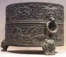Although the treaty acknowledged both huangdi and chanyu as equals, Han was in fact the inferior partner since it was forced to pay tribute to appease the militarily powerful Xiongnu.[42] Emperor Gaozu was initially set to give his only daughter to Modu, but under the opposition of Empress Lü, Emperor Gaozu made a female relative princess and married her to Modu.[43] Until the 130s BCE, the offering of princess brides and tributary items scarcely satisfied the Xiongnu, who often raided Han's northern frontiers and violated the 162 BCE treaty that established the Great Wall as the border between Han and Xiongnu.[44]