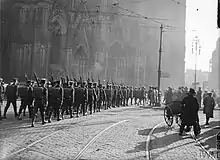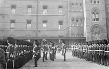 With the First World War at an end, occupation duties awaited the Irish Guards and on 11 December 1918 the regiment marched into Germany, drums beating, as part of the British Army of the Rhine.[41] Both battalions returned to Britain victoriously in the spring of 1919 and after a final parade through London, the 2nd and 3rd Irish Guards were now surplus to requirements and disbanded.[42] In 1920, for St Patrick's Day, the regiment donned its full-dress for the first time since before the outbreak of World War I. The regiment was also compelled to cope with the internal tensions caused by the political situation back home in Ireland following the end of the First World War although the regiment remained largely detached from the events of the Irish War of Independence, with only one member of the Irish Guards being charged with trying to smuggle weapons to republicans and even this act was motivated by a desire for monetary gain rather than political motives.[43]