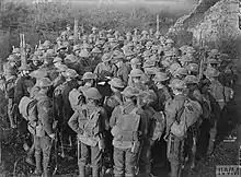 1st Irish Guards spent the first day of the offensive in reserve before joining their sister battalion on 1 September.[28] Further actions took place for the 1st Irish Guards at the Battle of the Menin Road Ridge, where they beat off several German counterattacks, and at the Battle of Poelcapelle, during which the battalion lost every one of its company commanders although 2nd Irish Guards suffered few casualties.[29]