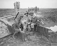 The 1st Battalion suffered huge casualties between November 1–8 holding the line against near defeat by German forces, while defending Klein Zillebeke, with No. 3 Company suffering severe casualties on November 1 and No. 1 Company being caught in the open after a French retreat on November 6 exposed their flank, ensuring that at the end of the day "the greater part of them were missing".[13] By the end of First Battle of Ypres on the 22 November, the battalion had suffered over 700 casualties and could only field two companies from the survivors.[14] The 2nd Division, of which the 1st Irish Guards were part of, suffered 5,769 officers and men killed, wounded or missing in action. The original battalion of 1st Irish Guards which had arrived in France barely two months before had been practically wiped out and had to be reconstructed with new arrivals.[15] The rest of 1914 and early 1915 was spent in the trenches with little action, although the soldiers were at risk from snipers and shells.[16]