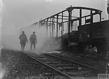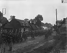 The Irish Guards took part in the Battle of Cambrai, the first large use of the tank in battle took place during the engagement.[29] The 1st Irish Guards initially enjoyed a quite sector for the opening of the battle until 30 November when they suffered heavy casualties fighting through the streets of the village of Gouzeaucourt.[31] The Guards Division, and with it the 1st and 2nd Irish Guards, were pulled off the line on 6 December for a rest period, having fought almost continuously since the start of August.[32]