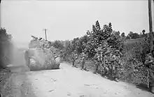 Following the Normandy landings on 6 June 1944, the 2nd and 3rd Irish Guards were landed in France on 25 June to take part in the Normandy Campaign. The Irish Guards, as part of the Guards Armoured Division, took part in Operation Goodwood (18–20 July).[55] The Division's objective was Cagny, Vimont and the surrounding area. During 18 July 1944, near Cagny, Lieutenant (later Sir) John Gorman of the 2nd Battalion, Irish Guards was in his Sherman tank when he was confronted by a far superior German Tiger II or 'King Tiger'. Gorman's tank fired one shot at the Tiger II, but the shot bounced off its thick armour. The Sherman's gun jammed before a second shot could be fired, and Gorman then gave the order to ram the Tiger II just as it was beginning to turn its massive 88mm gun on his tank. The Sherman smashed into the Tiger II, the collision disabling both tanks. The crews of both tanks then bailed out. Lieutenant Gorman, once he had seen his crew to safety, returned to the scene in a commandeered Sherman Firefly and destroyed the King Tiger. He was awarded the Military Cross for his actions, while the driver from his own crew, Lance-Corporal James Baron, won the Military Medal.[55] The Irish Guards were involved in the further fighting that raged around Cagny for the rest of the day. Cagny, devastated by heavy bombing, was finally liberated by the Guards on the morning of 19 July.[56] The Irish Guards also saw action in Operation Bluecoat launched on 30 July which saw the British capture the strategically important high ground around the Mont Pincon area.[57] Following the breakout from Normandy and rapid advance through the more open French terrain, the 2nd and 3rd Irish Guards crossed the River Seine on 29 August and began the advance into Belgium with the rest of the Guards Armoured Division towards Brussels which was liberated on 3 September.
