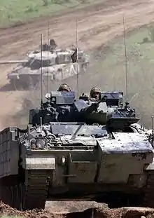 The Irish Guards were not in Germany long before the Yugoslav Wars meant they were called on to deal with the troubles in the Balkans in 1999. The regiment formed the Irish Guards Battle Group which was split with a company of the Irish Guards deployed to Macedonia while the rest deployed to Kosovo, where heavy fighting had broken out between Serbian forces and Kosovo Albanian rebel groups.[73] The Irish Guards were the first British unit to enter the Kosovan capital city of Pristina on 12 June and were greeted by the local population who treated the Guards like heroes.[74] After the city had been secured the British troops began to consolidate their position, moving across the surrounding countryside to secure it. The Irish Guards performed professionally, attempting to prevent violence from breaking out between the Albanian and Serb Kosovans while also helping to rebuild the country. The Irish Guards left the Balkans in September 1999, heading back to their base in Germany.[75]